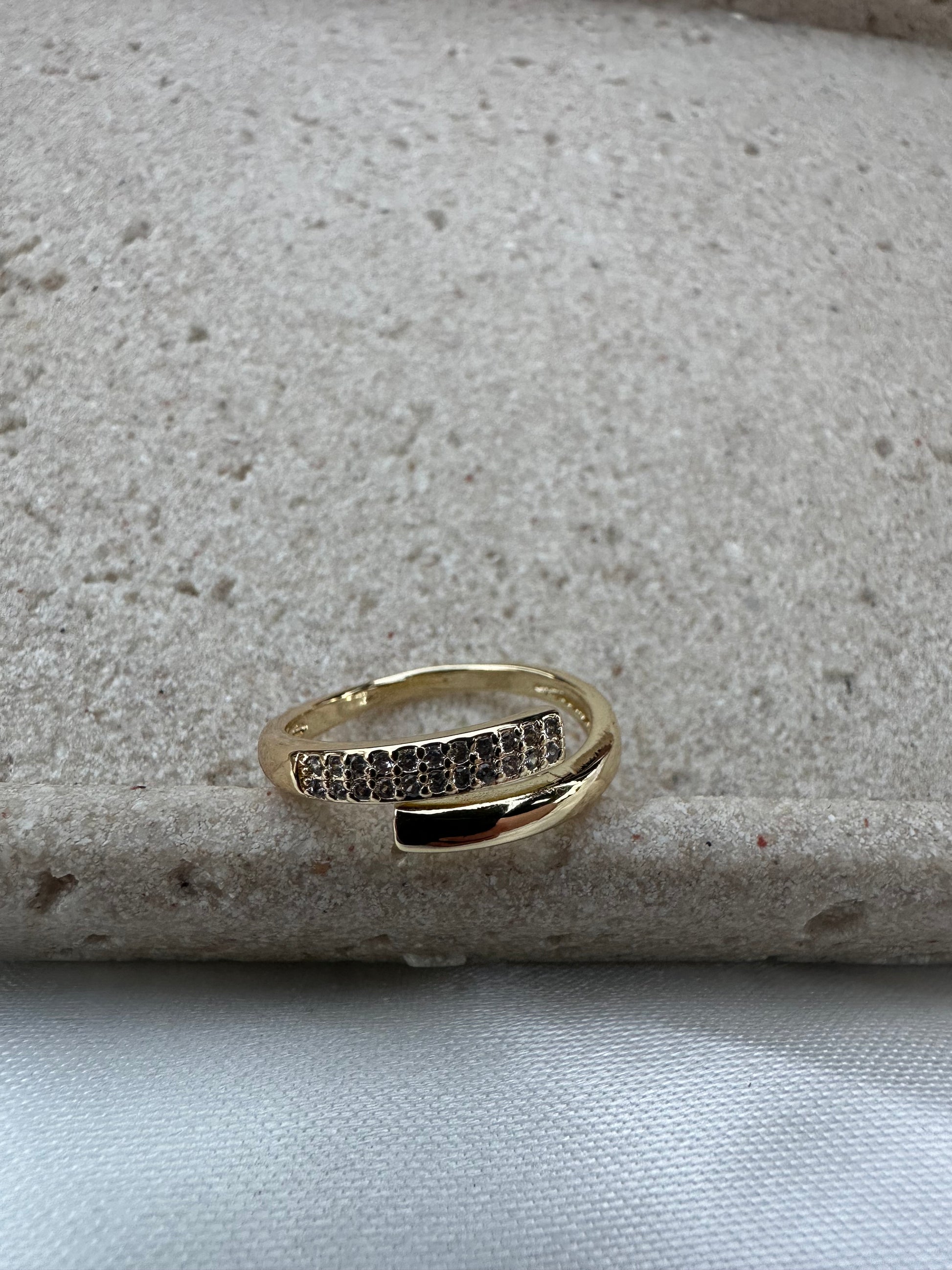 Modern elegance meets everyday wear in this gold-plated overlap band ring. One side of the band features a smooth polished finish, while the other sparkles with rows of pave-set crystals, creating a beautiful balance of shine and sophistication.