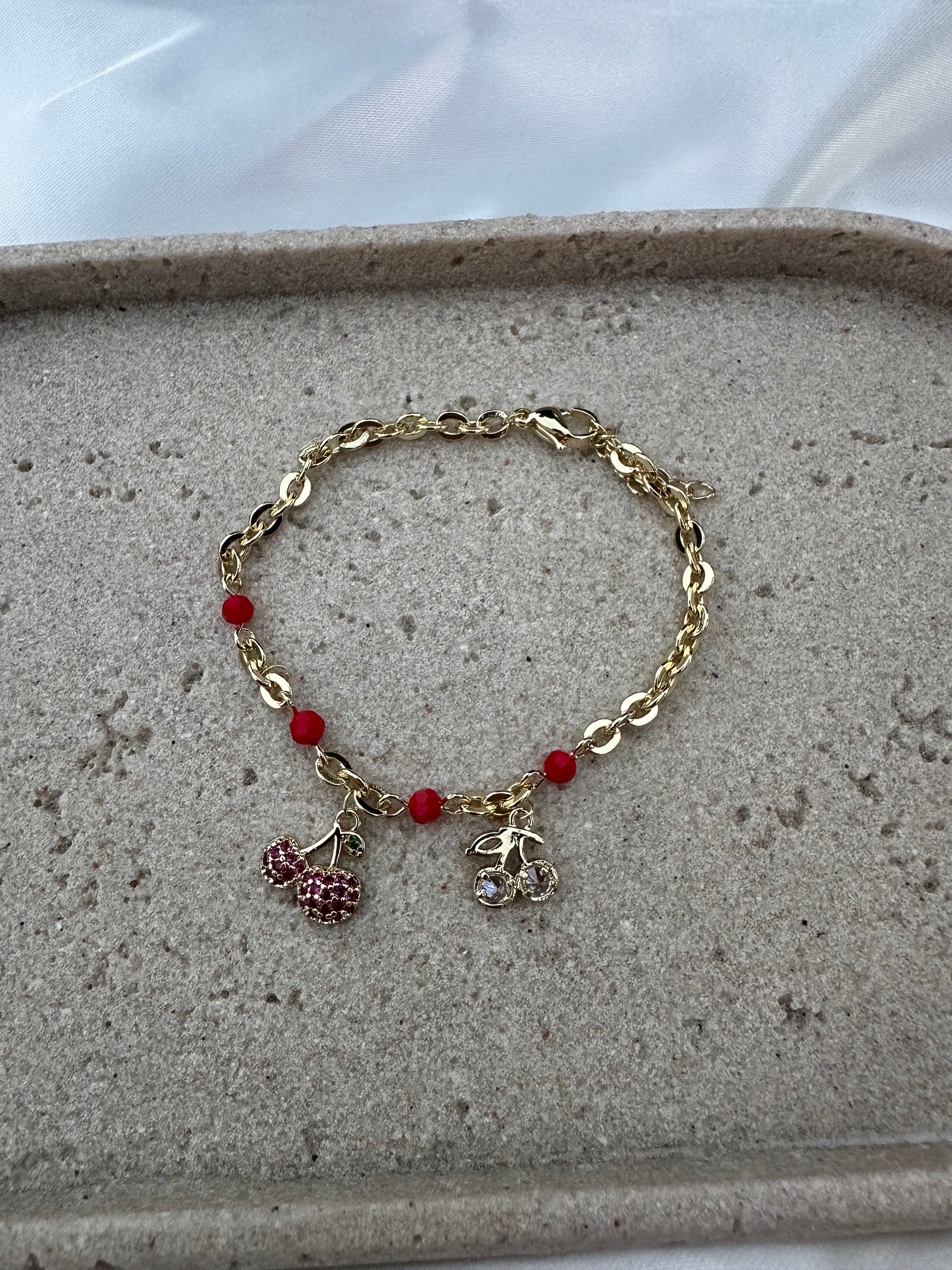 Add a pop of fun to your jewelry collection with this adorable cherry charm bracelet. Featuring gold-plated chain links, bright red beads, and two sparkling cherry charms—one encrusted with ruby-toned stones and the other with clear crystals—this piece is as sweet as it is stylish.
